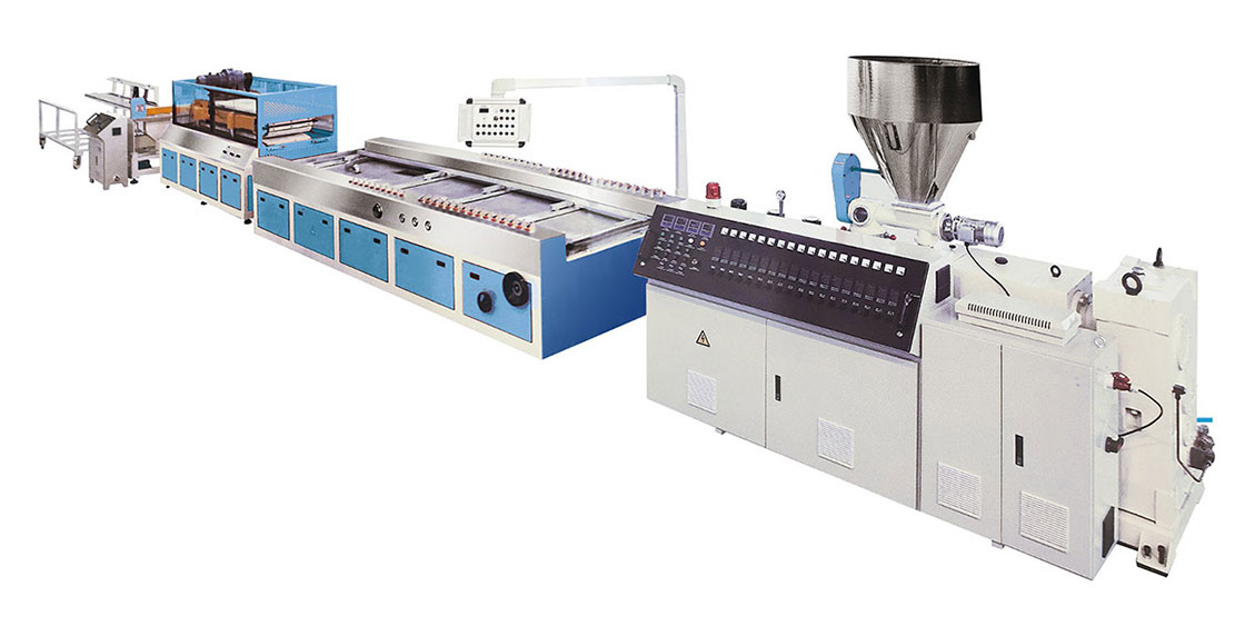PVC木塑生產線主要用于門窗型材,窗臺板,微發泡型材,木塑室內裝飾型材,木塑室外裝飾型材等的擠出。該生產線可以根據不同型材斷面及模具,選用不同規格的雙螺桿擠出機,并配置相應的真空定型臺,牽引機,切割機,翻料平臺等輔助設備。